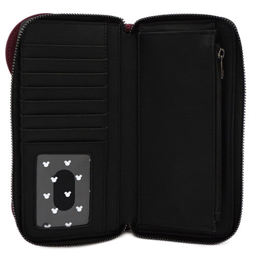- Disney - Cartera de piel sintética con cremallera alrededor de 8" acolchada en color granate de Minnie Mouse