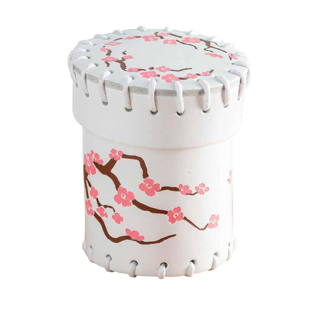 Esa experiencia nos ha inspirado a crear esta taza de dados de cuero japonesa. Lo hicimos de cuero natural en color blanco y adornamos su tapa y cuerpo con un estampado colorido; ¡Muestra una rama de cerezo marrón cuando comienza a que está empezando a cobrar vida con flores rosadas!