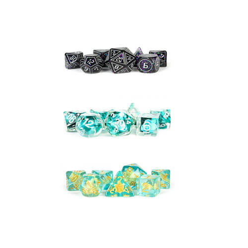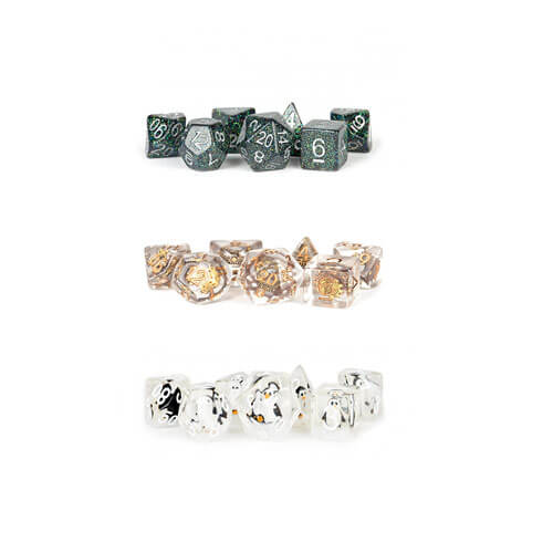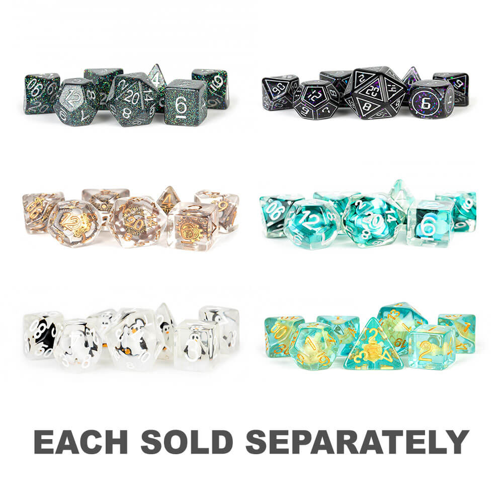 MDG -harpiks terninger har unikke indeslutninger, der tilføjer opblussen til ethvert spilbord. Dette er 16 mm polyhedrale terninger i fuld størrelse, der leveres med 7 terninger (D4, D6, D8, D10, D10%(00-90), D12 og D20).