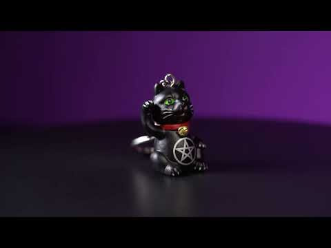 Mystisk nøglering formet som en heldig sort kat. Har livlige grønne øjne, en gylden klokke og pentakeldesign på en traditionel nøgleringring