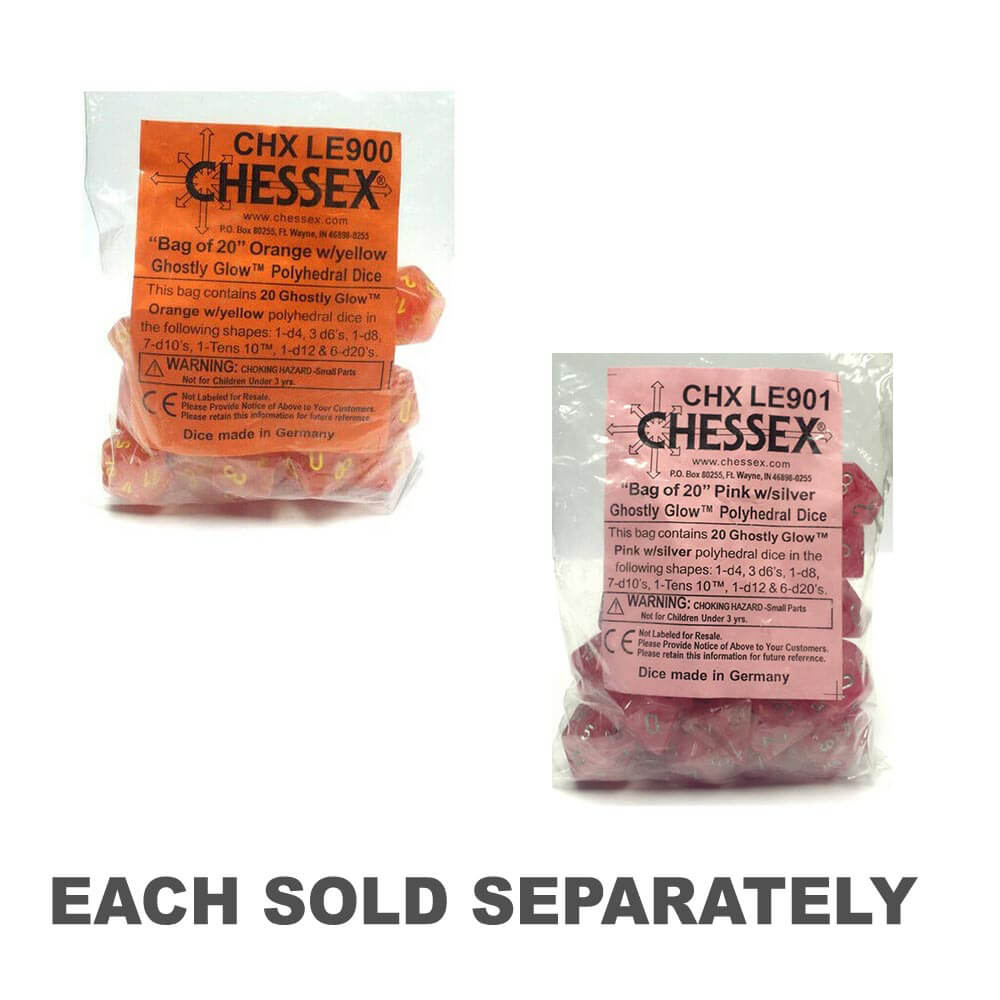 • Beutel mit 20 polyedrischen Ghostly Glow-Würfeln – Orange mit gelben Zahlen