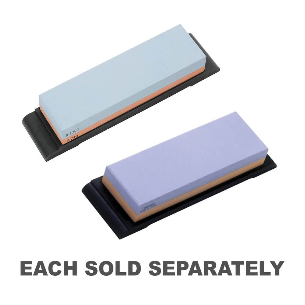 Dieser Kombi-Schleifstein von GLOBAL wurde speziell für den Einsatz mit Küchenmessern in Profiqualität entwickelt. Wenn Sie die detaillierten Anweisungen in der Verpackung befolgen, können Sie spektakuläre Ergebnisse erzielen, die sogar die Schärfe der Messer ab Werk übertreffen! Dies ist die empfohlene Methode, um Ihre Messer im besten Gebrauchszustand zu halten. Dieser Stein verfügt über zwei verschiedene Körnungen – 240 und 1000. Die Körnung 240 gilt als „grobe“ Oberfläche und sollte verwendet werden, wenn die Messerklingen abgebrochen, beschädigt oder völlig stumpf sind. Die Körnung 1000 wird als „mittlere“ Körnung eingestuft und ist der Hauptstein zum Schärfen stumpf gewordener Messer.