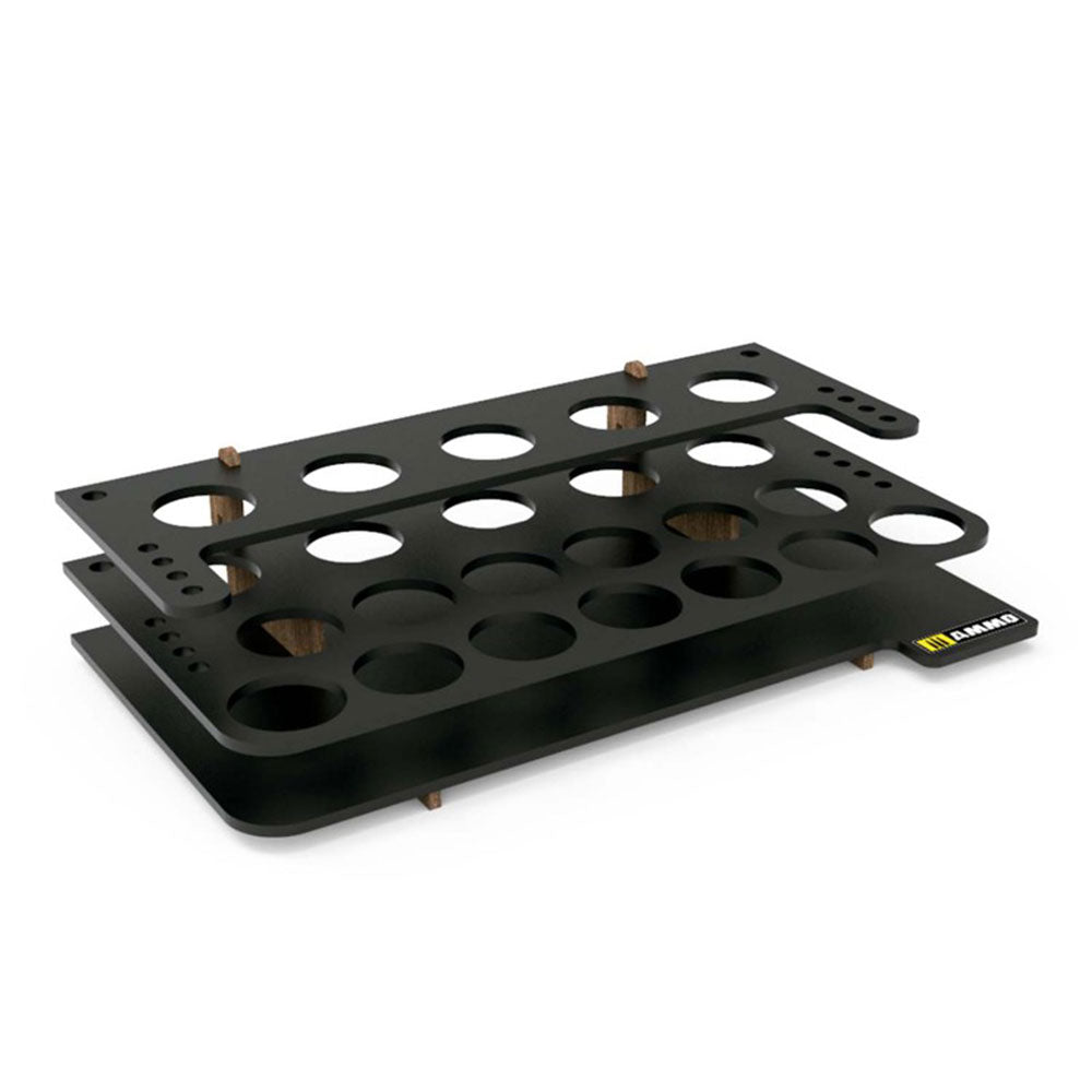 Modul mit schwarzem Satin-Finish, ideal für 18 x 17 ml Flaschen AMMO mit Mig Jimenez-Acrylfarbe oder 5 Flaschen Dio DryBrush-Farben. Bietet Platz für 10 Pinsel in verschiedenen Größen.