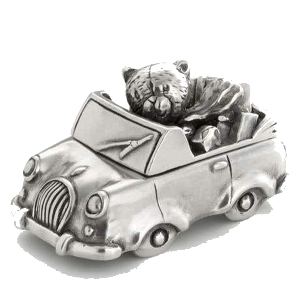 Junge Teddy betritt das Picknick in seinem Oldtimer-Cabrio voller Geschenke.