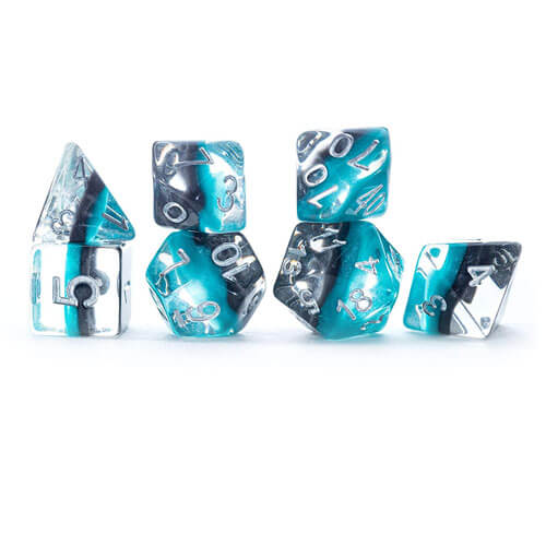 • Farben: Midnight Black & Dreams of Teal – Silberne Nummerierung. Eclipse-Würfel sind geschichtete Würfel (4) mit zwei dünnen Schichten heller Perlmuttfarbe, eingebettet zwischen zwei vollkommen klaren, transparenten Außenschichten!