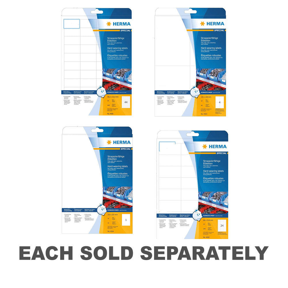 Ensure durability and reliability with Herma Hard-Wearing Labels! This pack includes 10 A4-sized labels in white, designed to withstand tough conditions and maintain clarity and legibility. With a strong adhesive backing, these hard-wearing labels adhere securely to various surfaces, ensuring long-lasting attachment. Whether for industrial environments, outdoor applications, or harsh conditions, these white hard-wearing labels offer resilience and efficiency for all your labeling needs. Get ready to label with confidence using Herma Hard-Wearing Labels!