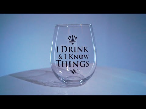 - Black decal reads 'I Drink and I Know Things' with regal symbols.