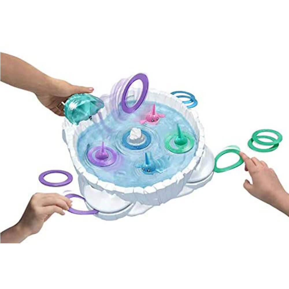 Score points by flipping your colored rings onto the tusks of the narwhals floating in the ice arena. Earn bonus points when your rings land on the narwhal that matches your color or on the center iceberg. The player with the most points at the end of the game wins!