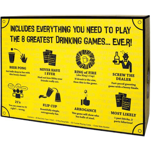 Este es un iniciador de fiesta instantáneo y proporciona todo lo que necesitas para jugar los 8 mejores juegos de beber. ¡Todo lo que necesitas hacer es agregar amigos y alcohol!