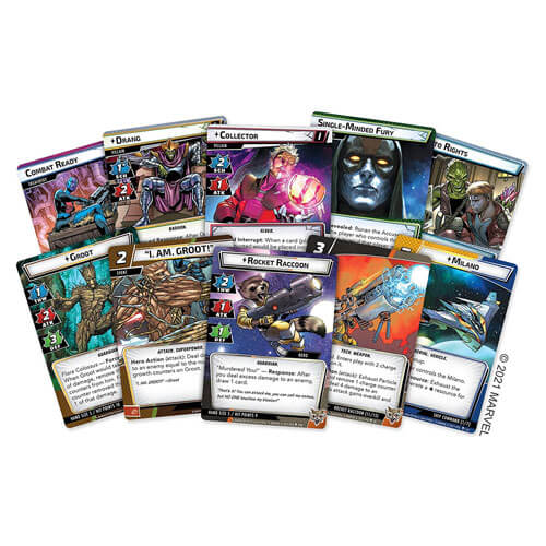 - HÉROES IMPROBABLES: Dentro de The Galaxy's Most Wanted, encontrarás dos pre- mazos de héroes construidos listos para lanzarte a luchar junto a los Guardianes de la Galaxia: Groot y Rocker Racoon.