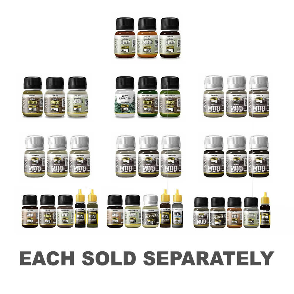 El conjunto de pigmentos que necesitas para darle a tus kits el aspecto oxidado que deseas. Incluye tres tonos; un pigmento naranja para óxido fresco y reciente (A.MIG LIGHT RUST-3006), un tono más oscuro para óxido más antiguo (A.MIG TRACK RUST-3008) y un color óxido de tono medio. (A.MIG -3005 ÓXIDO MEDIO)