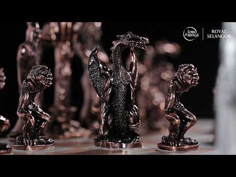 Comienza la batalla por la Tierra Media. Aragorn y Galadriel lideran una banda de entres, magos y hobbits contra Sauron y Shelob's Horde of Saruman, Gollum, Dragons y Orcs. Mundido en la peltre, con enchapado de cobre para distinguir a los ejércitos opuestos, el juego tiene lugar en un tablero de ajedrez de madera y marquetería de peltre.