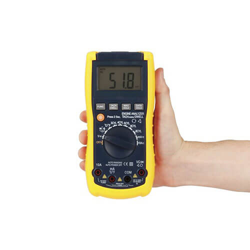 Parfait pour l'atelier en tant qu'analyseur de moteur ainsi que DMM de base. Mesure de l'angle de résidence complète et tacho, avec max / data Held et LCD rétro-éclairé brillant.