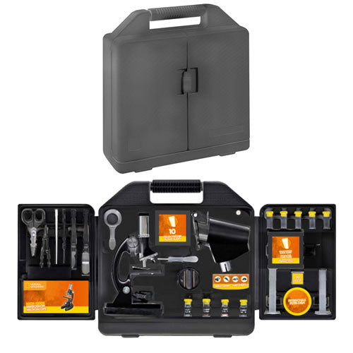 • Le cas de transport inclus garantit que votre microscope n'est pas seulement un outil de découverte en laboratoire, mais aussi un compagnon portable pour l'exploration sur le terrain.