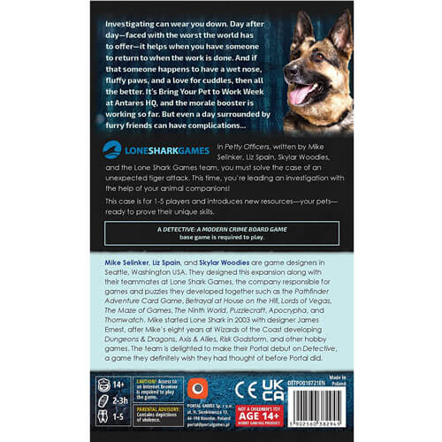 Parfois, tout le monde a besoin d'une pause, même d'agents spéciaux. Ils rentrent à la maison avec un besoin désespéré d'un câlin. Surtout si c'est un câlin de quelqu'un poilu, avec un nez humide et une queue remuant. Mais les câlins ne sont pas leur seule spécialité. Ils peuvent également résoudre une enquête criminelle ... Les petits officiers sont une expansion du légendaire détective du jeu du conseil d'administration de la criminalité par Ignacy Trzewiczek. L'expansion a été écrite par le célèbre Mike Sellinker, avec Liz Espagne, Skylar Woodies et l'équipe Lone Shark Games. Mais cette fois, les animaux de compagnie rejoignent l'équipe d'investigation Antares!