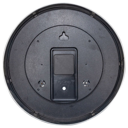 This wall clock has a brushed aluminium case that frames the white dial. The black numbers, minute markings and bold black and red hands make the time, temperature and humidity easy to read.