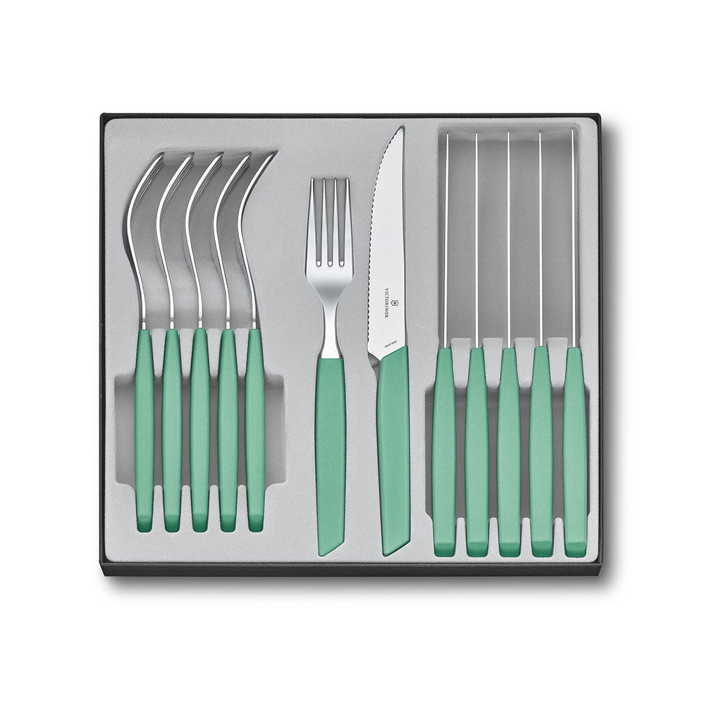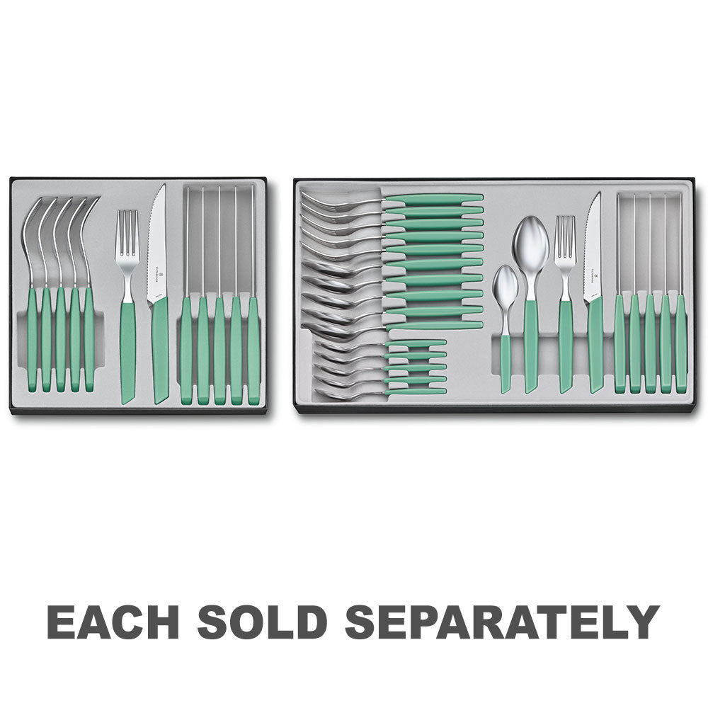 - Contenuto della scatola: 1 set di posate moderne Swiss Victorinox, 12 pezzi: forchette per la cena 6 x, 6 coltelli da bistecca/pizza, materiale per lama: acciaio inossidabile, colore: verde menta, oggetto n. : 6.9096.12w41.12