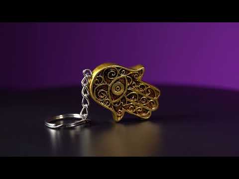 神秘的な手描きのハムサハンドキーチェーン。従来のキーチェーンリングでメタリック仕上げの複雑なHamsaデザインが特徴です。