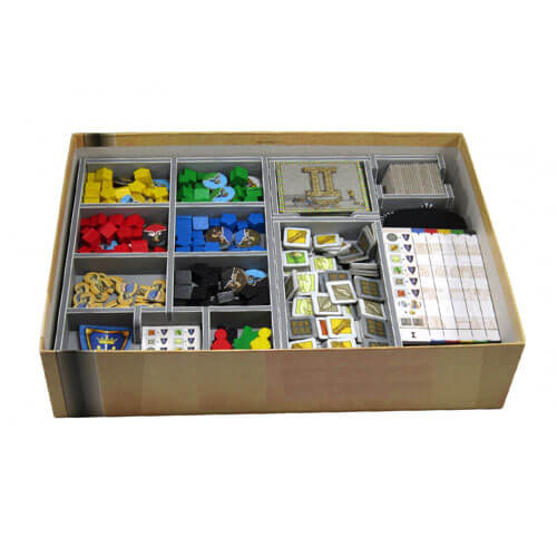 このインサートは、Orleans®と互換性があるように設計されており、5番目のプレーヤー拡張のためのスペースが含まれています。このデザインは、効率的なストレージと改善されたゲームプレイの両方を提供します。多くのトレイはゲーム中に利用でき、セットアップと明確な時間を大いに助けます。ボードとプレーヤーのボードは、トレイの上にふたとして機能します。