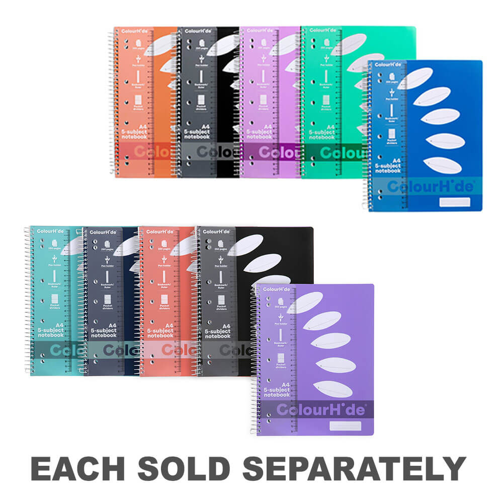 Colourhide Notebookは、学校、大学、職場、家のいずれであっても、メモや情報を書き留めるための素晴らしいツールです。スパイラルサイドバインディングと、追加の保護用のポリプロピレンハードカバー、および書くための十分なスペースがある250ページがあります。 5つの別々の被験者に分かれているため、メモと情報を整理できます。