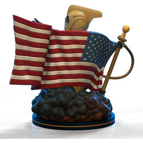 - Rocketeer Q-fig Eliteは、燃えるようなジオラマのディスプレイベースから、私たちのヒーローの後ろに渦巻くアメリカの旗の上部にある高さ5インチです。