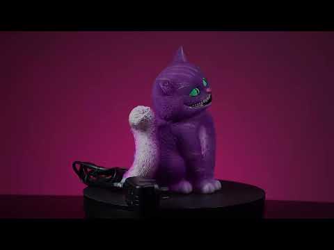 LED -tafellamp van een grijnzende gekke kat met levendige turquoise ogen. Maakt overdag een uniek ornament en licht 's nachts de kamer op. Lage spanning geleid veilig voor kinderen.