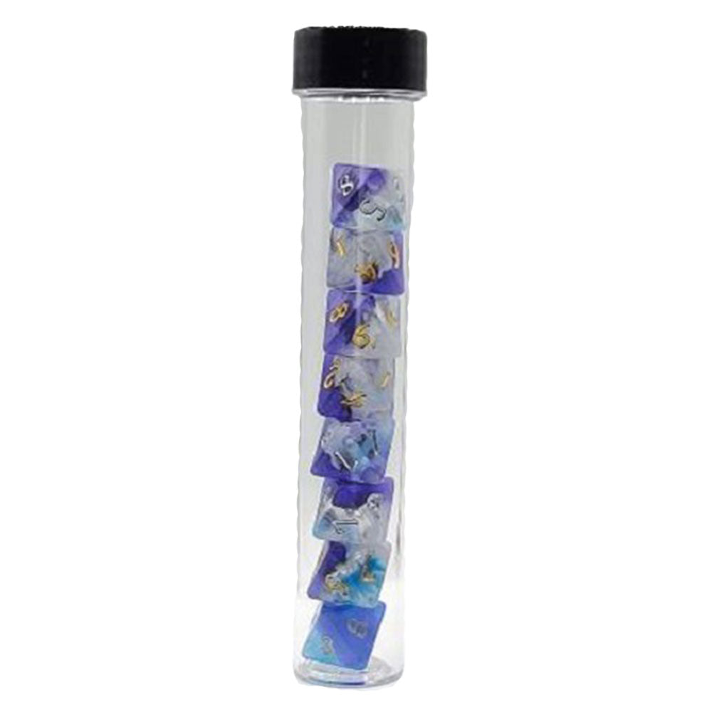 • 8 D8 dobbelstenen in een buis met platte bodem.
