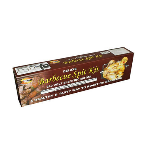 Deluxe Barbecue Spit Kit. Elektrisk motor er vurdert til 12,5 kg og har et varmeskjold i rustfritt stål og automatisk omvendt for overbelastningsbeskyttelse. Passer de fleste 3 til 6 brenner hette grilling