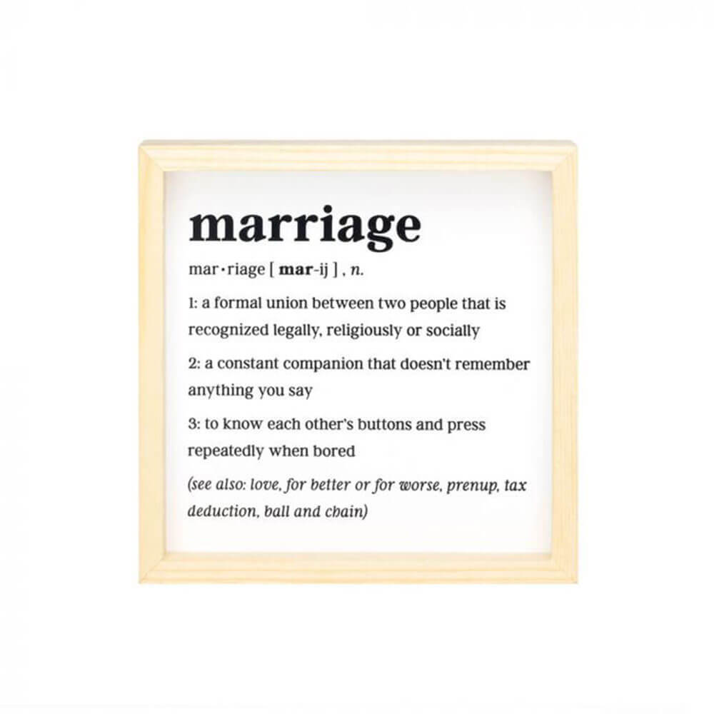 Ta zdefiniowana sztuka mini w ramce ma minimalistyczny czarno -biały definicja z oryginalną definicją małżeństwa. Idealny prezent dla twojego znaczącego drugiego z okazji rocznicy lub tylko dlatego!