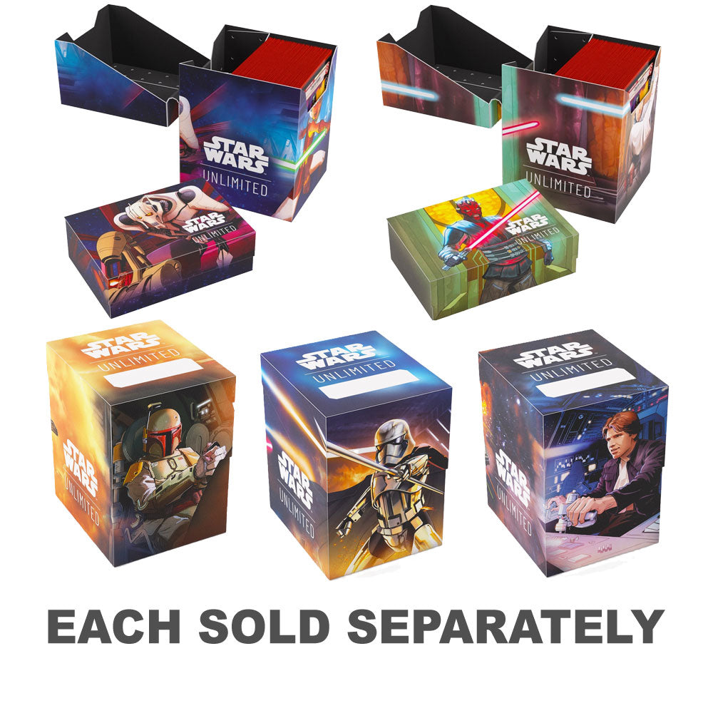 The Star Wars: Unlimited Soft Crate is the all-in-one casual solution for Star Wars: Unlimited players. This full color printed and officially licensed deck box is packed with ingenious features. It protects a full double-sleeved deck of cards and includes an innovative token box! This token box has a smart click-lock mechanism to keep all tokens safely stored – even while pulling it out. Once opened, the lid of the box stays upright for convenient access during gameplay.