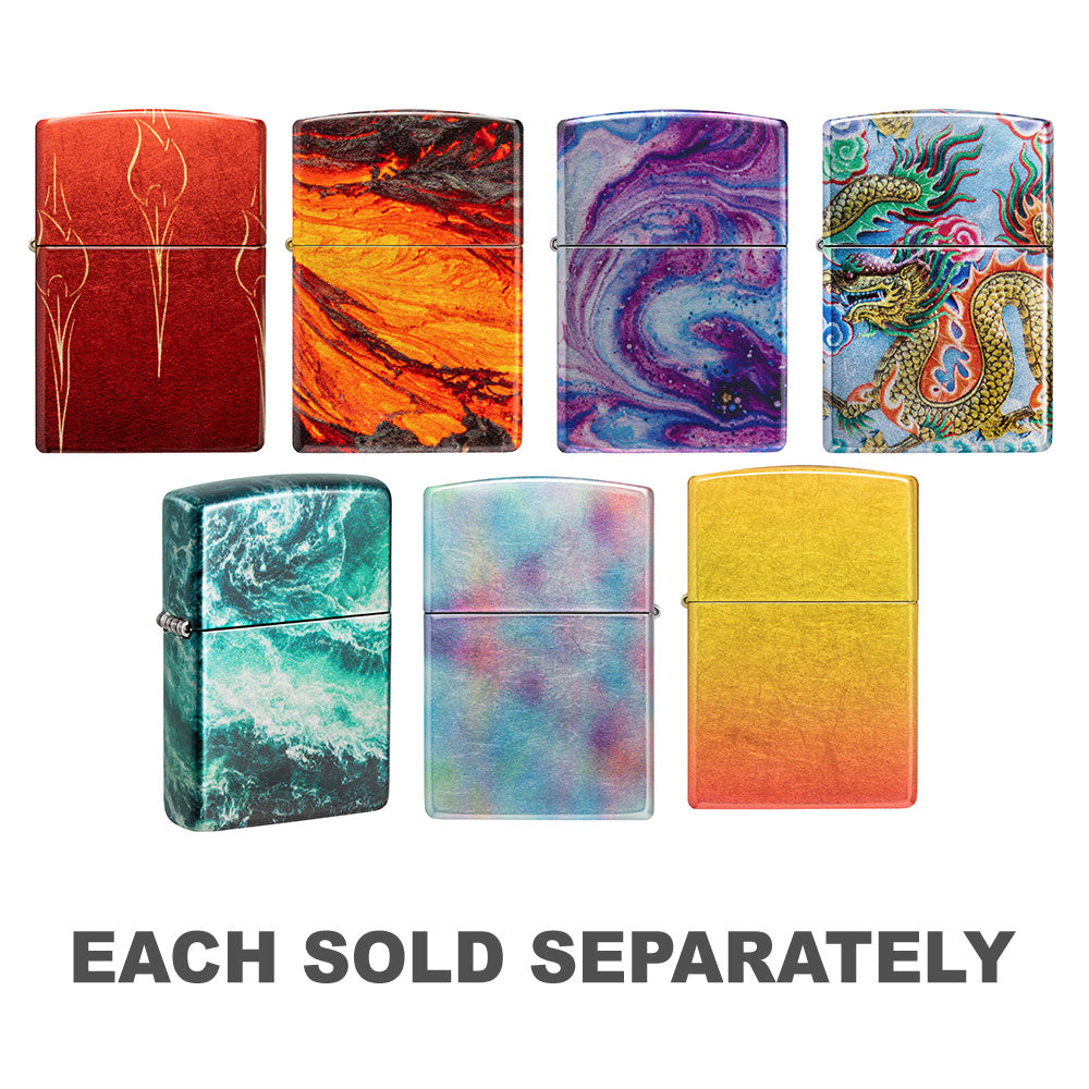 El encendedor de diseño de fusión Zippo Dragon 540 está hecho de toda la construcción de metales, el diseño a prueba de viento funciona prácticamente en cualquier lugar. Una evolución totalmente nueva de dos de nuestros métodos de impronta más buscados. Los elementos metálicos brillantes y las paletas de colores elegantes y translúcidas, el sello distintivo del proceso de fusión unen fuerzas con la tecnología de color 540 patentada para envolver el más ligero en todos los lados para un resultado final sin costuras, iridiscentes y absolutamente impresionantes. Este diseño de dragón vívido gira sobre un telón de fondo geométrico rojo y se complementa con el logotipo a lo largo de un lado.