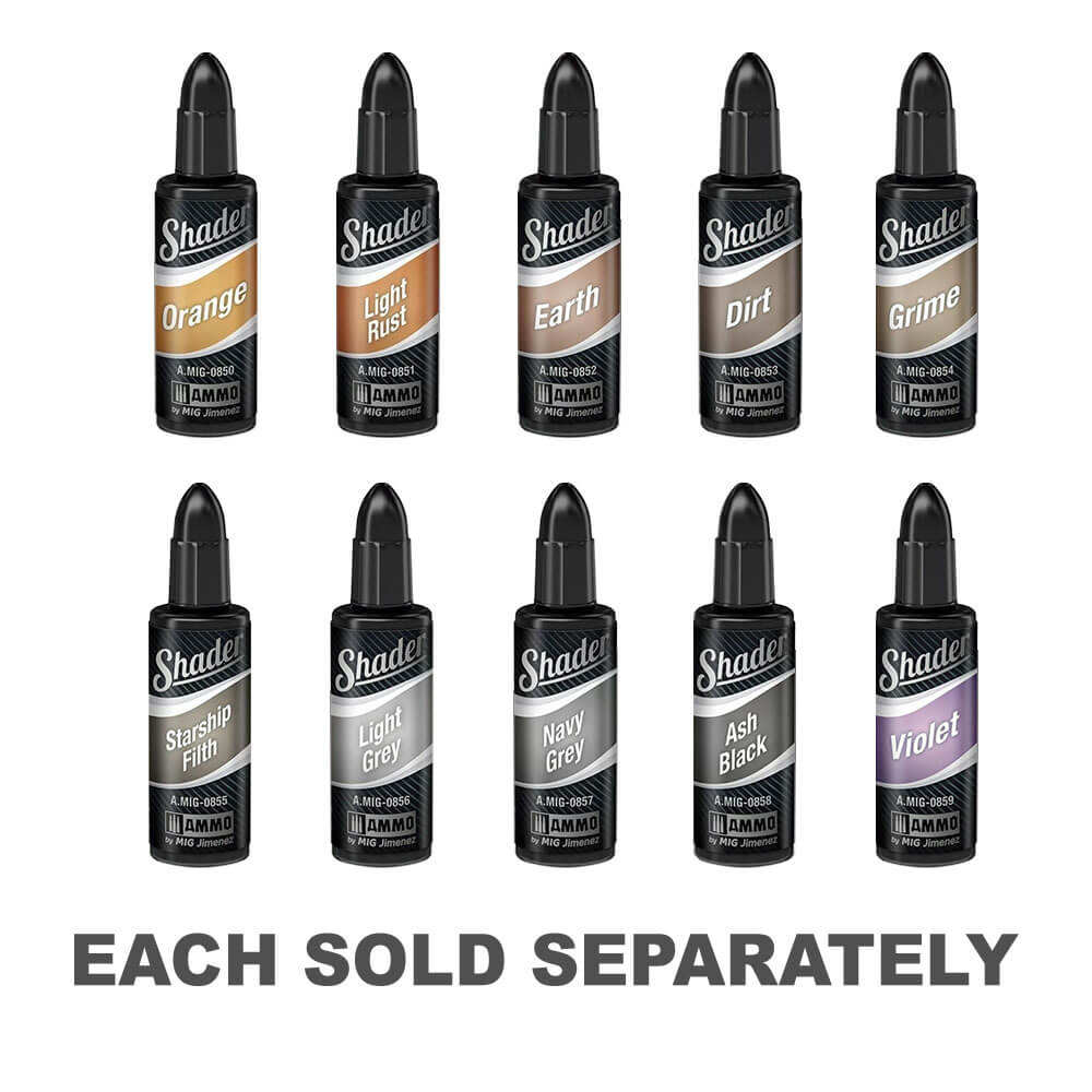 Från blekningseffekter till slitage, skuggor och höjdpunkter, ändra färgerna till olika nyanser, kan detta nya sortiment till och med appliceras för att åstadkomma basfärger som ett filter. Shaders Range ger din modell en dynamisk och intressant finish på bara några minuter, vilket gör dessa färger perfekta för modellerna nya i hobbyen. De alla nya egenskaperna gör det möjligt för modellerare att skapa effekter som hittills bara kunde uppnås med hjälp av mer komplexa tekniker som glasurer, tvättar eller filter.